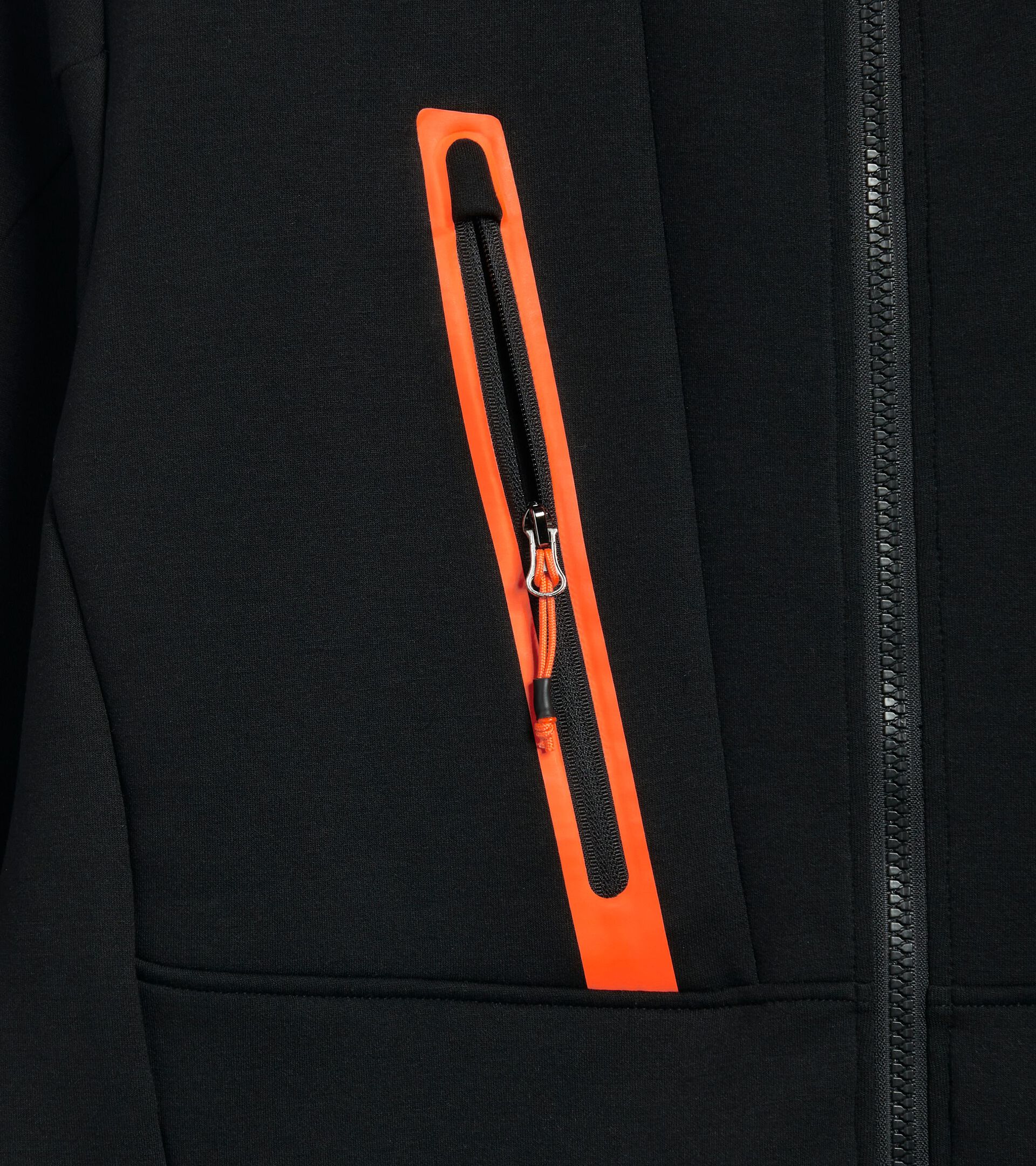 Felpa full zip in scuba con collo in piedi. Zip frontale termonastrata con dettagli fluo a contrasto. Maniche ergonomiche e licra sul fondo dei polsini. Tasche laterali con zip. Parte posteriore allungata per una migliore vestibilità.