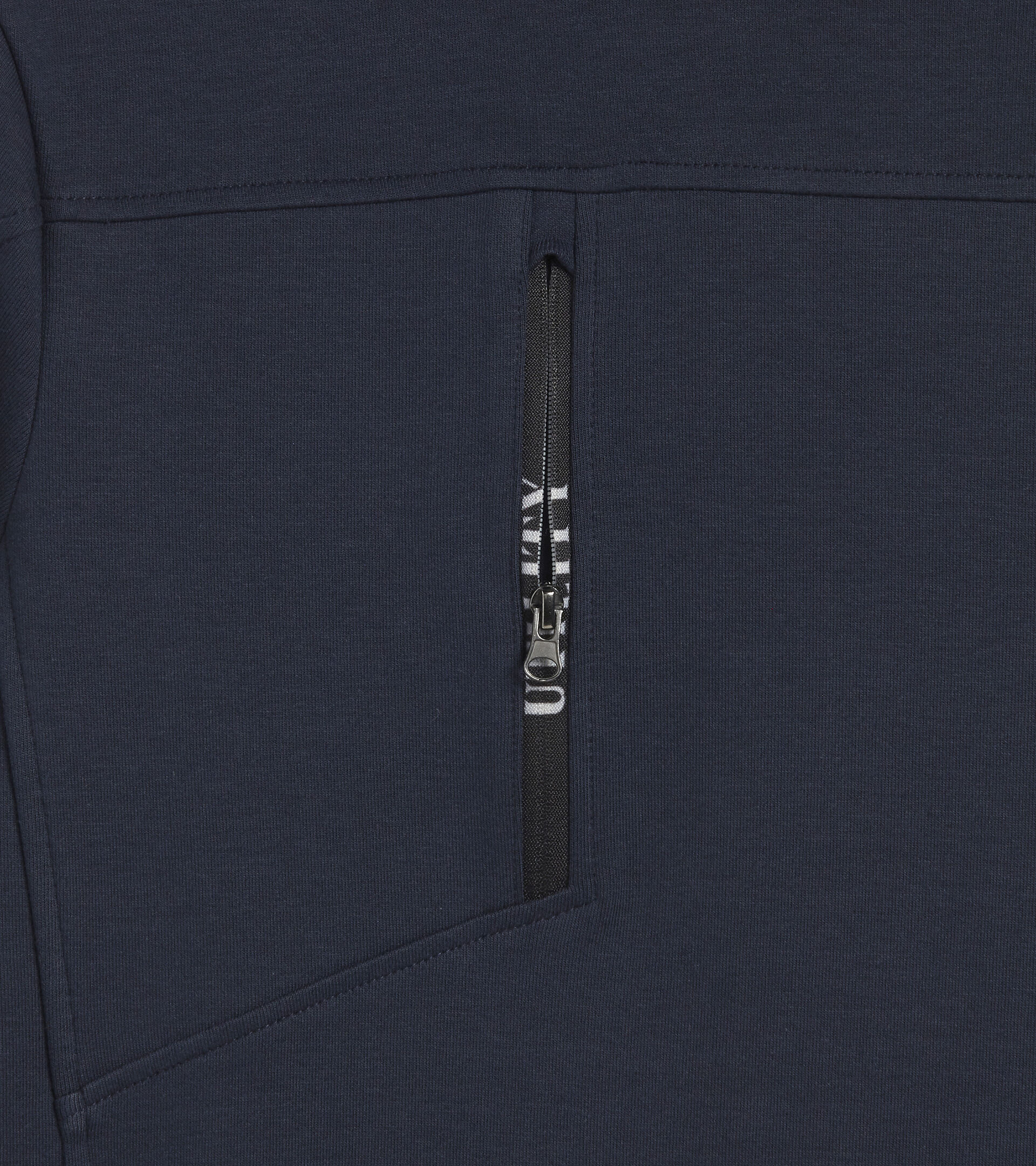 Il tessuto leggero Interlock 85% cotone, 15% poliestere da 280 gr/m² si adatta perfettamente a tutte le stagioni, garantendo un'ottima traspirazione e libertà di movimento sia in inverno che in primavera. Il capo è caratterizzato da girocollo con inserti laterali neri sulle maniche ergonomichedue tasche aperte laterali per avere gli oggetti più importanti a portata di mano, e una tasca frontale con zip. Collo, polsini e fondo sono in costina elasticizzata.