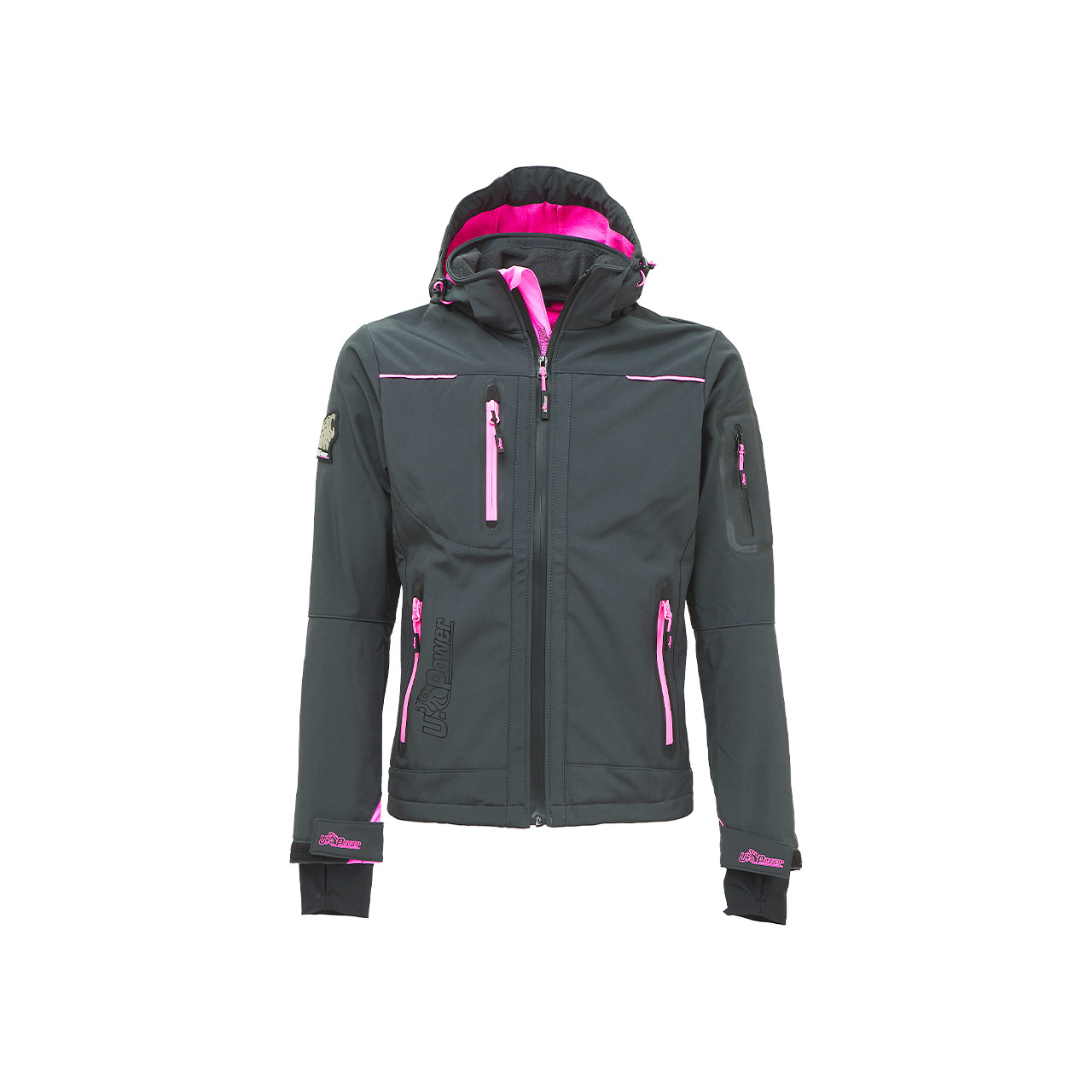 Tasca supplementare termosaldata su manica sinistra. Fondo sagomato. Nastro reflex su colletto nella parte posteriore. Logo U-Power tono su tono.