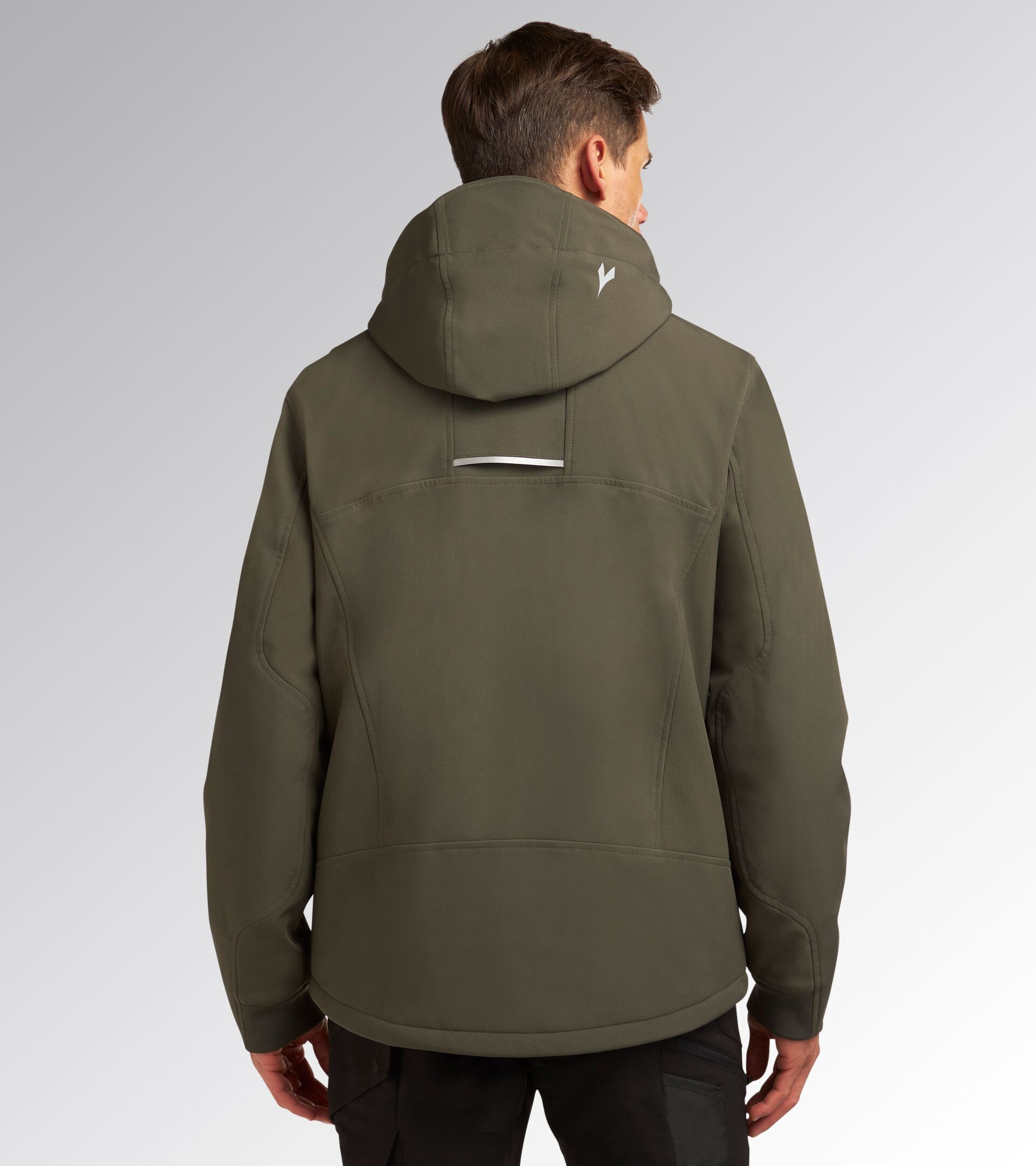 Giacca in softshell con imbottitura leggera, antivento e trattamento idrorepellente. Inserto salvabarba, cappuccio staccabile con doppia regolazione e frontino sagomato. Due tasche laterali e una tasca frontale con zip, dettagli reflex e stampa termonastrata personalizzata Utility. Maniche ergonomiche. Inserti interni in 3D mesh con apertura sul carrè posteriore per una traspirabilità ottimale. Fondo regolabile con coulisse e parte posteriore più lunga per miglior vestibilità.