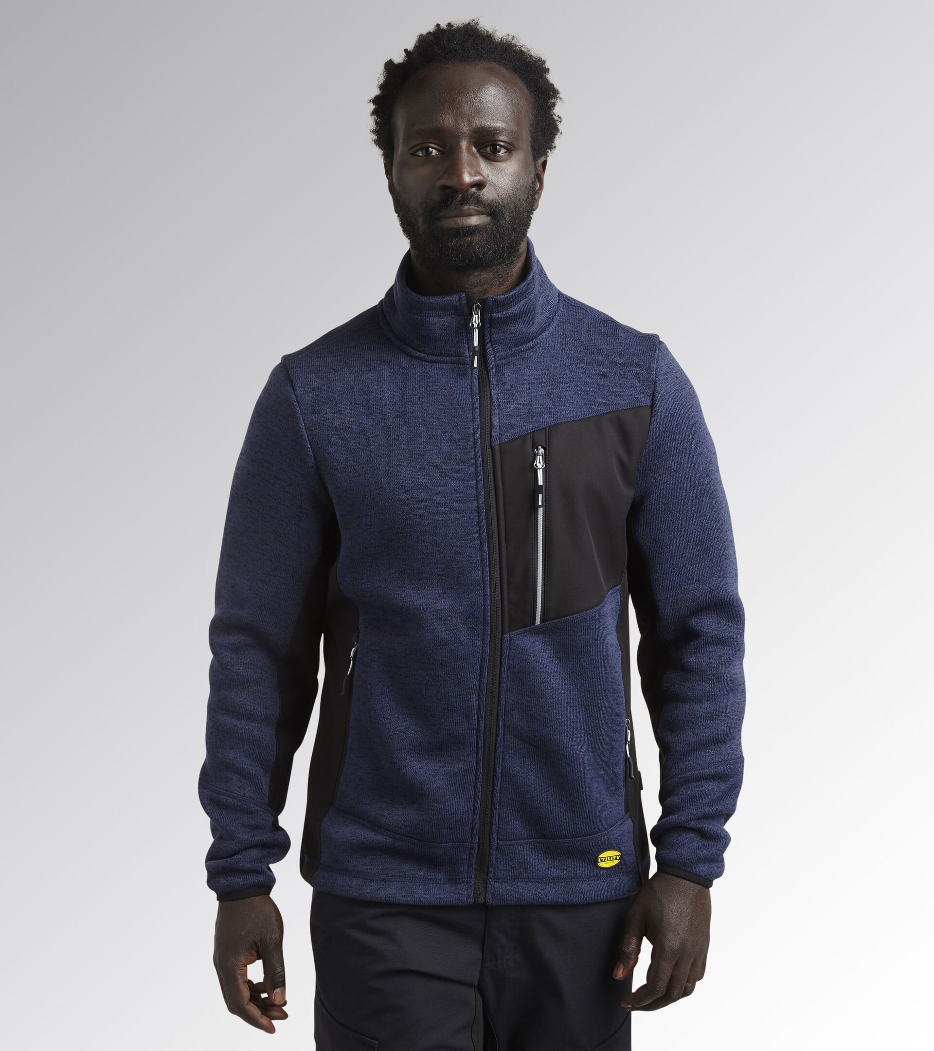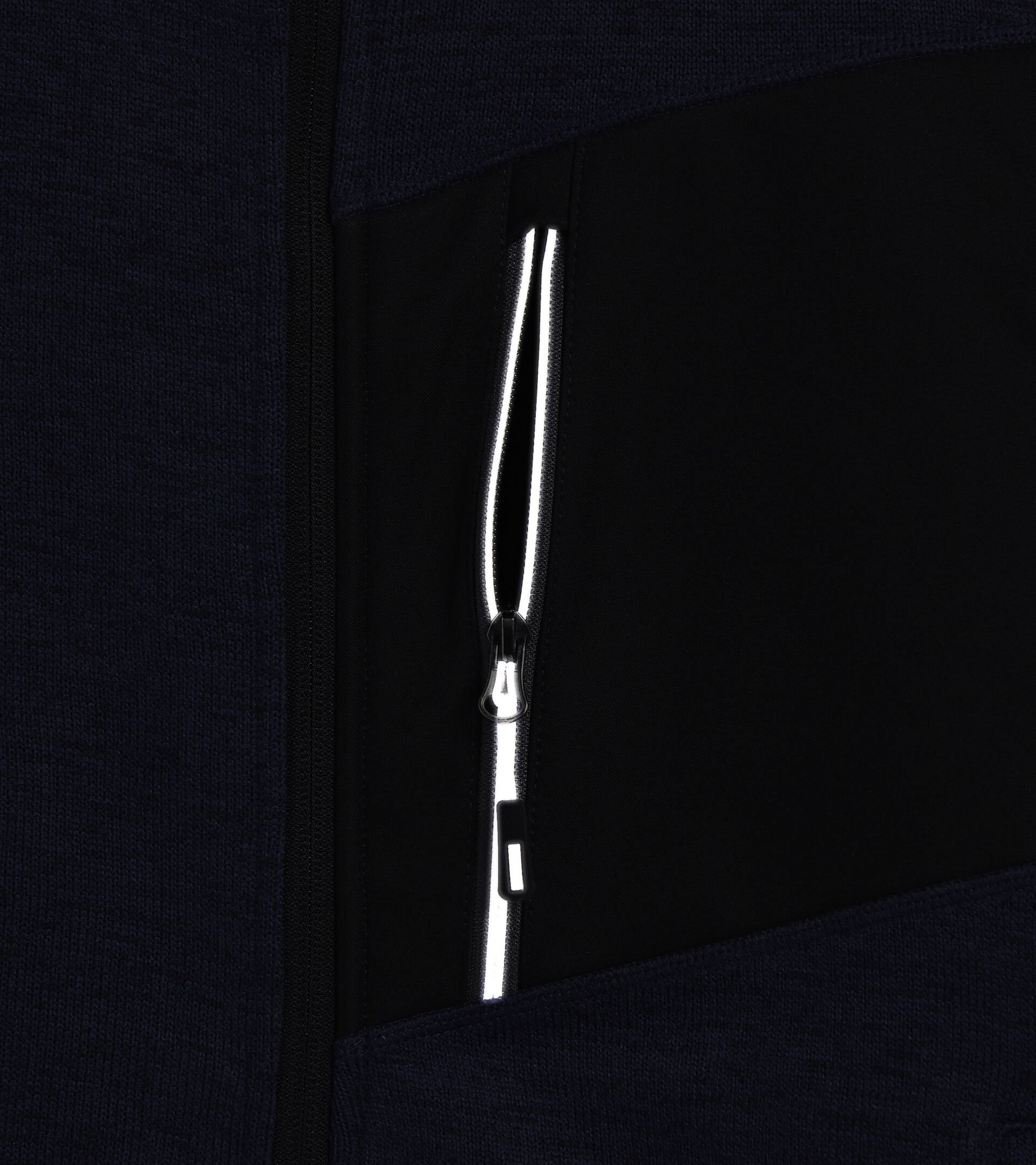 Felpa a giacca con lavorazione esterna in maglia ed interno garzato, collo in piedi con maniche ergonomiche. Parte posteriore più lunga per una miglior vestibilità. Due tasche laterali e una frontale con chiusura zip e dettagli reflex. Fondo regolabile con coulisse.