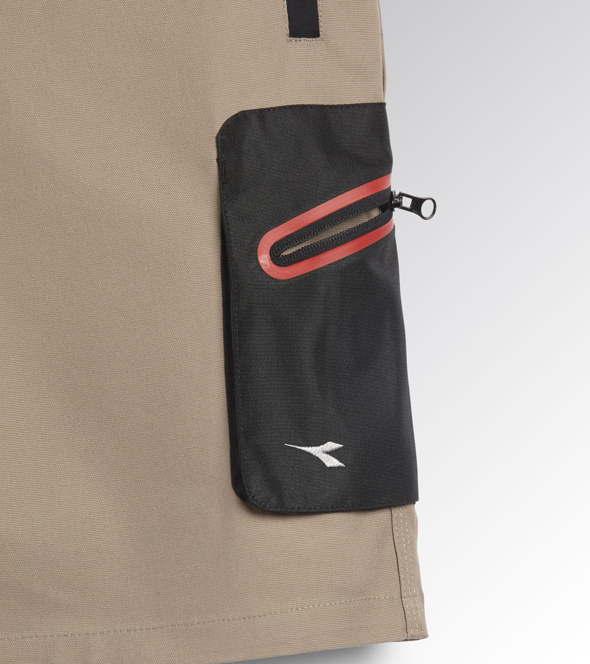 Bermuda in cotone canvas elasticizzato con tasca laterale zippata in poliestere Oxford resistente all’abrasione e dettaglio termonastrato rosso e tasche mani zippate. Elastico in vita, portametro e portamartello, tripla cucitura.