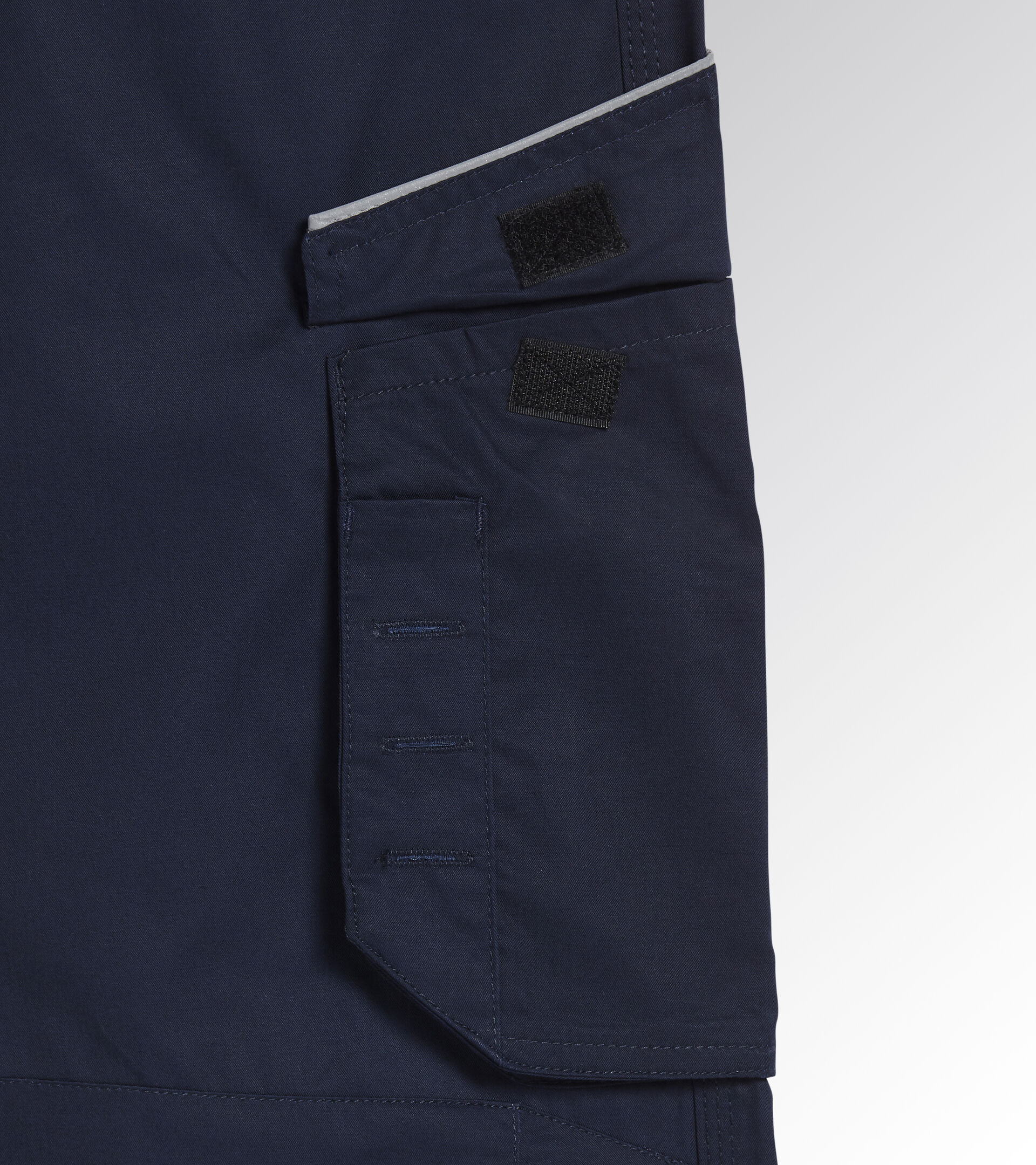 dettagli rifrangenti, tasca portametro, portamartello, elastico in vita, tripla cucitura.