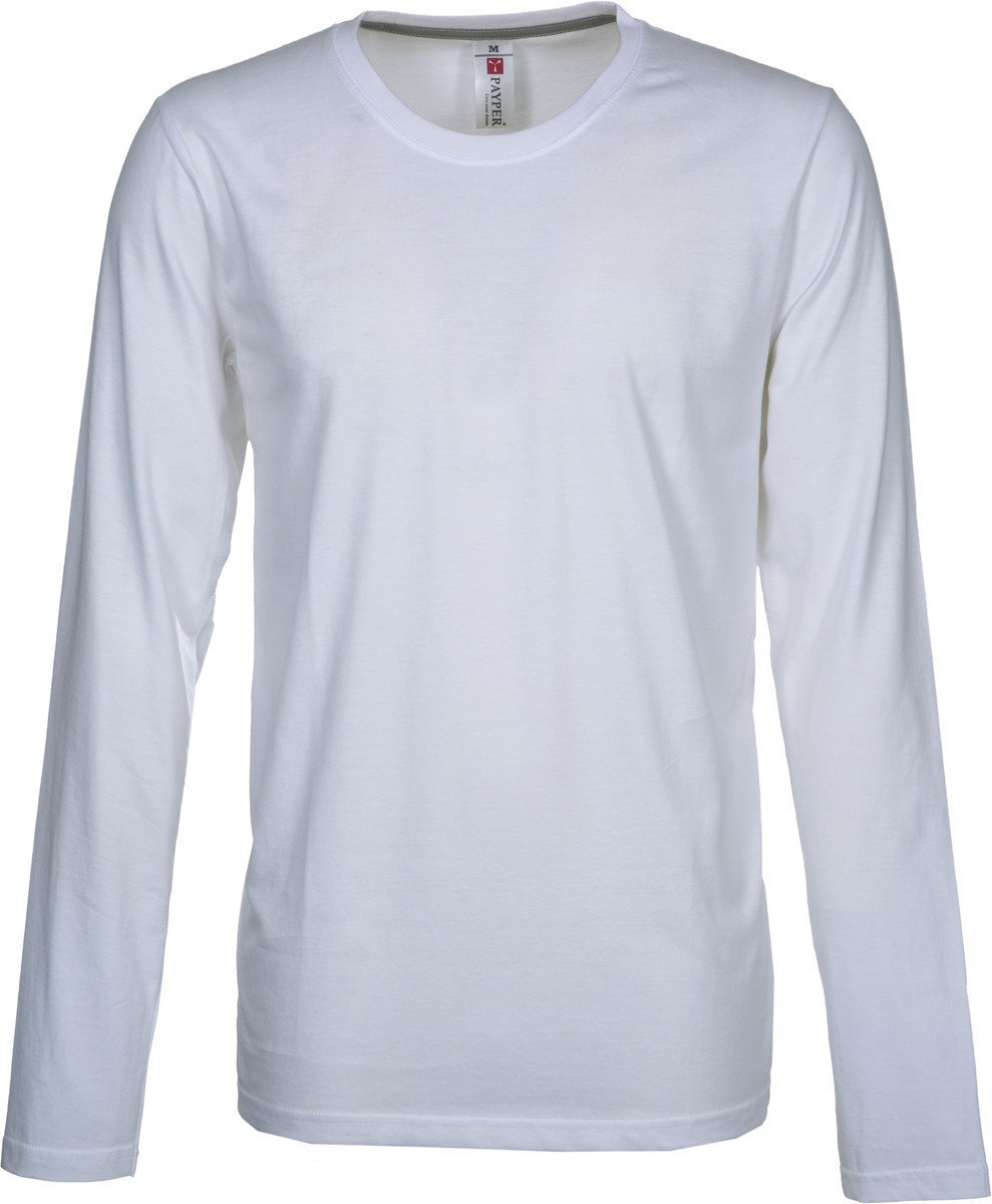 T-shirt girocollo PINETA manica lunga colore BIANCO, colletto in costina misto spandex da 1.5 cm con cucitura ribattuta sul davanti, maniche corte e strette, vestibilità più precisa e nastro di rinforzo da spalla a spalla in colore a contrasto visibile nel colletto, struttura tubolare.