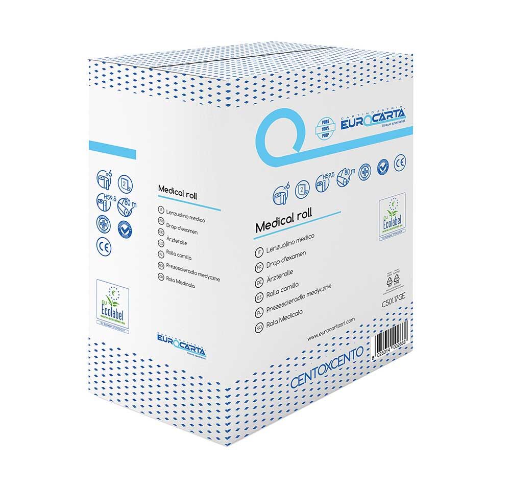 Lenzuolino medico singolarmente confezonato in ctx da 6rt, doppio velo goffrato microcollato in pura cellulosa. Dispositivo medico Classe 1. Dermatologicamente testato. Certificato Ecolabel.